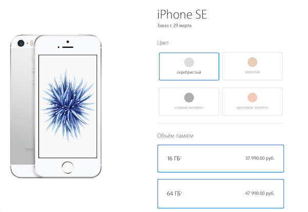 Продажи нового iPhone SE стартуют в России с 29 марта 2016. Вы сможете оформить предзаказ на официальном сайте Apple. Цена iPhone SE стартует с 37990 РУБ.- за 16 ГБ версию.