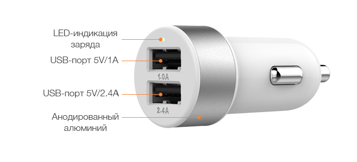 Автомобильное зарядное устройство с двумя USB-портами для iPhone, iPad и любых других устройств, заряжающихся с помощью USB-кабеля. В адаптере есть порт, выдающий напряжение 1А, подходящее для смартфонов и плееров, а акже порт, выдающий 2,4А, чего вполне достаточно для зарядки планшетов, в т.ч. iPad и Samsung. Заряжать можно два устройства одновременно, причем с одинаково быстро.