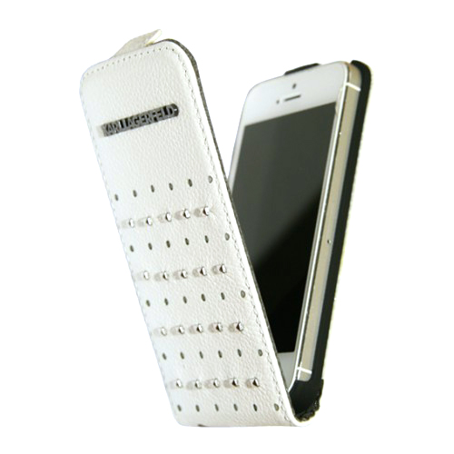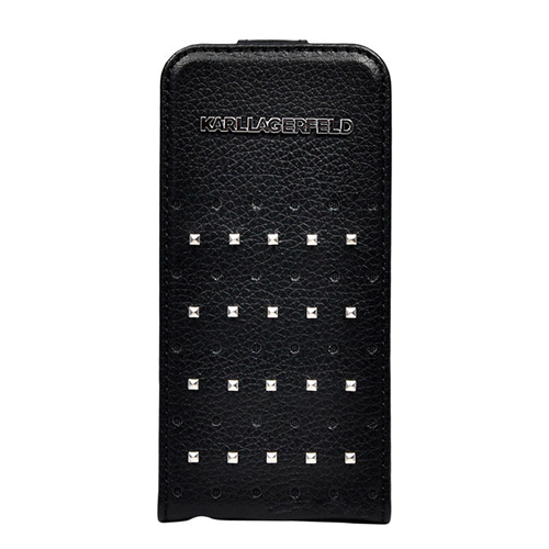 Чехол-флип для iPhone 5 или iPhone 5s из натуральной кожи. Этот стильный чехол с металлическими шипами-заклепками и перфорацией создан в модном доме, носящем имя легендарного Карла Лагерфельда. Яркий неординарный дизайн в рок-н-рольном стиле понравится даже самым отъявленным модникам и модницам.