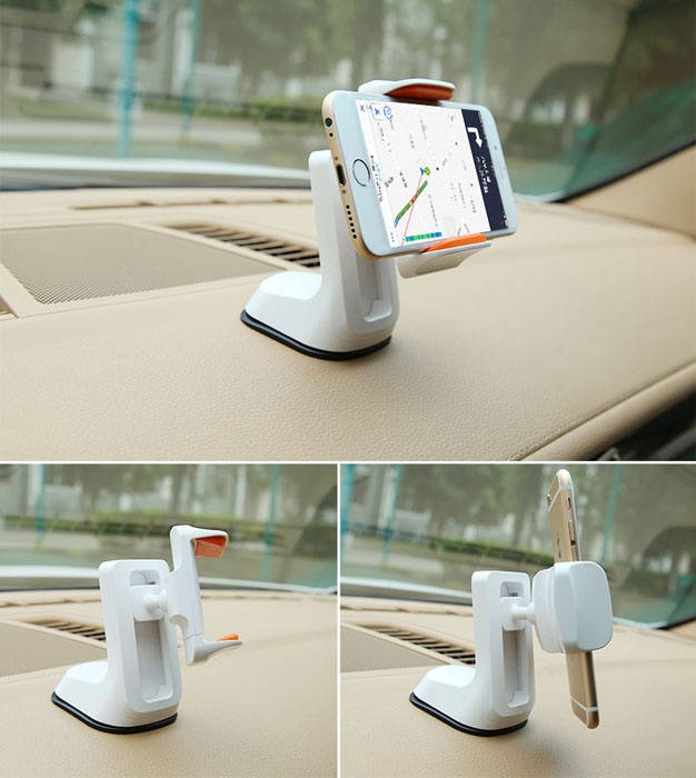 Держатель для телефона в машину. Приспособление крепится на торпеду в машине с помощью специальной "волшебной присоски", которая надежно фиксируется на поверхности и дополнительно блокируется с помощью небольшого переключателя. Ракурс и угол наклона держателя можно регулировать и надежно фиксировать с помощью поворотного механизма.
