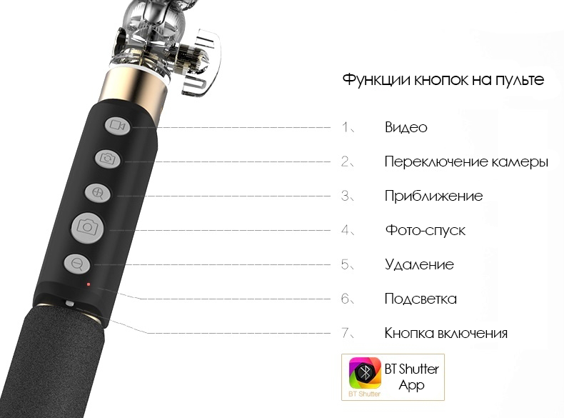 Смартфон подключается к моноподу через Bluetooth и специальное приложение BT Shutter, которое можно скачать в Appstore или Google Play (в зависимости от операционной системы вашего телефона). Это приложение можно использовать как обычную камеру, а управлять им с пульта, который, кстати, крепится на ручку монопода. С помощью кнопок на пульте можно пользоваться зумом, переключать режим съемки с фото на видео и обратно, а также с фронтальной на заднюю камеру. Причем, если раньше все это было доступно толь ко пользователям на Android, то теперь и на улице фанатов айфонов перевернулся грузовик с пряниками.