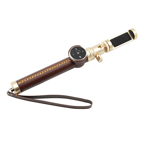 Этот комплект отличается роскошным подарочным оформлением - ручка монопода отделана кожей, из которой также сделан ремешок и клапан чехла. Крепление и раздвигающаяся часть палки для селфи сделаны из прочного анодированного алюминия, покрытие которого имитирует драгоценные металлы - золото, серебро, родий. Упаковано все в подарочную коробку из плотного матового картона, на которую надета часть упаковки с полезной информацией.