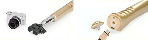 Универсально съемное крепление позволяет надежно зафиксировать в нем смартфоны различных моделей и марок, при необходимости его можно снять и закрепить на моноподе небольшую фотокамеру. Монопод можно также закрепить на штативе, сняв нижнюю крышечку, там же, кстати, находится и порт MicroUSB, через который девайс заряжается.