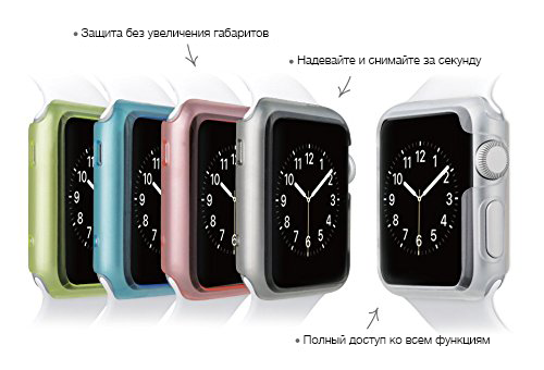 Набор из пяти разноцветных пластиковых чехлов для Apple Watch 42 mm Sport Edition. Чехлы предназначены для защиты корпуса умных часов от царапин, вмятин, сколов и других повреждений. Чехлы сделаны из особого, запатентованного Ozaki пластика, характеризующегося необычной прочностью при легкости и тонкости материала, один чехол весит всего 0,5 грамма.