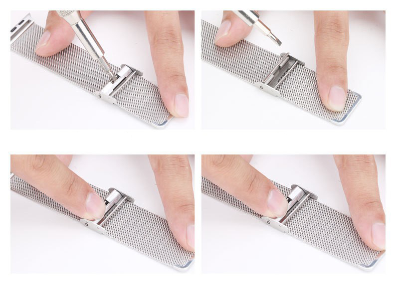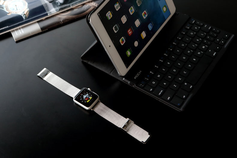 Также ремешок оснащен стандарными креплениями, поэтому его легко заменить с помощью нажатия кнопок на задней части корпуса Apple Watch. Удерживая их, просто сдвиньте по одной обе части расстегнутого браслета и они легко вытащится. На его место уже не нажимая кнопок можно вставить новый.